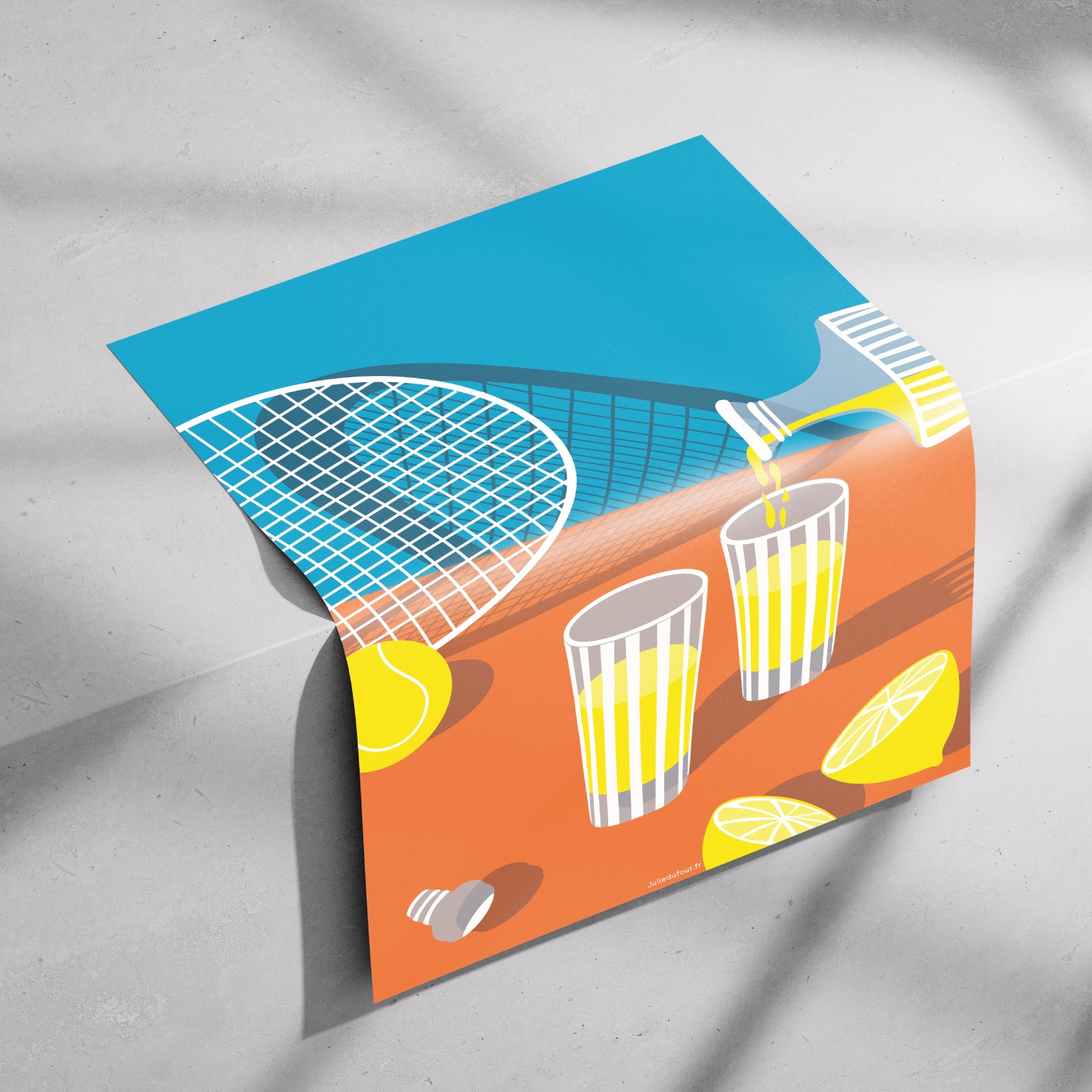Apportez une touche solaire à votre intérieur avec cette affiche illustrée d'un moment de vie typique chez les sudistes, Tennis et limonade " en plein cagnard " issue de ma collection dédiée à la Provence.